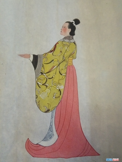 第一幅手稿只是簡(jiǎn)單地勾勒了人物線(xiàn)條,第二幅色彩稿需為人物加上服飾、發(fā)型、飾品。“每一位才女的服飾、發(fā)型都很講究,必須與當時(shí)的文化相符。”這些都需史料佐證,陳錫邦先后到國家博物館、南充絲綢廠(chǎng)等地進(jìn)行考察,為200位才女“穿衣化妝”。
